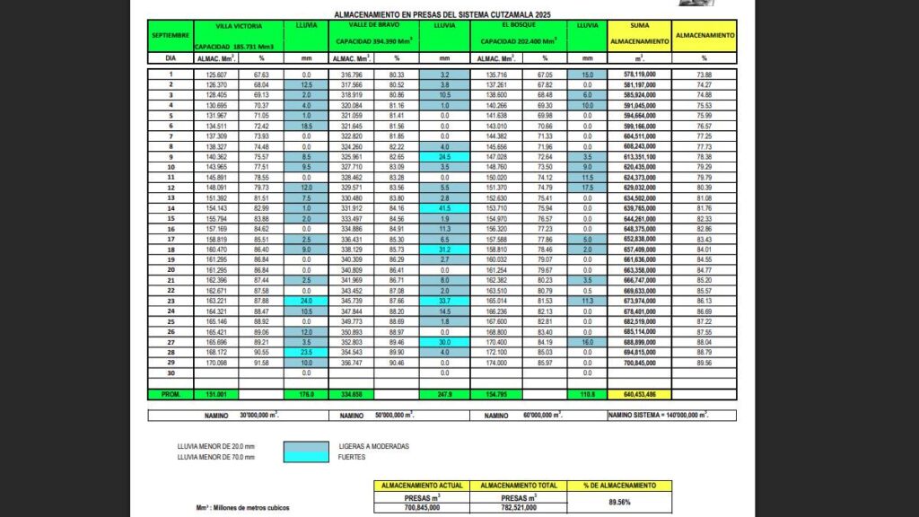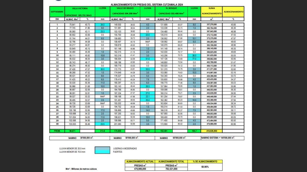 Por su parte, Villa Victoria mostró un incremento notable de 90.6 Mm³ a 151.0 Mm³, lo que refleja una recuperación significativa gracias a las lluvias de la temporada.