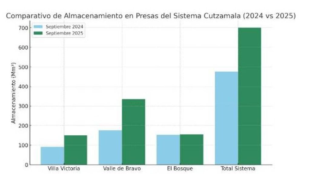 El Sistema Cutzamala cerró septiembre de 2025 con un repunte histórico en sus niveles de agua. De acuerdo con los reportes oficiales del Organismo de Cuenca Aguas del Valle de México, el almacenamiento total pasó de 476.9 millones de metros cúbicos en 2024 a 700.8 millones en 2025, lo que representa un aumento de casi 30 puntos porcentuales en un año.