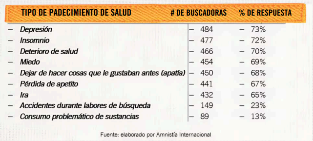 Para el 2024, el 97% de mujeres consultadas confesó que padeció violencia explícita o implícita en sus labores de búsqueda. La depresión, insomnio y deterioro de salud son algunas de las afectaciones explícitas e implícitas que padecen, producto de la desaparición.