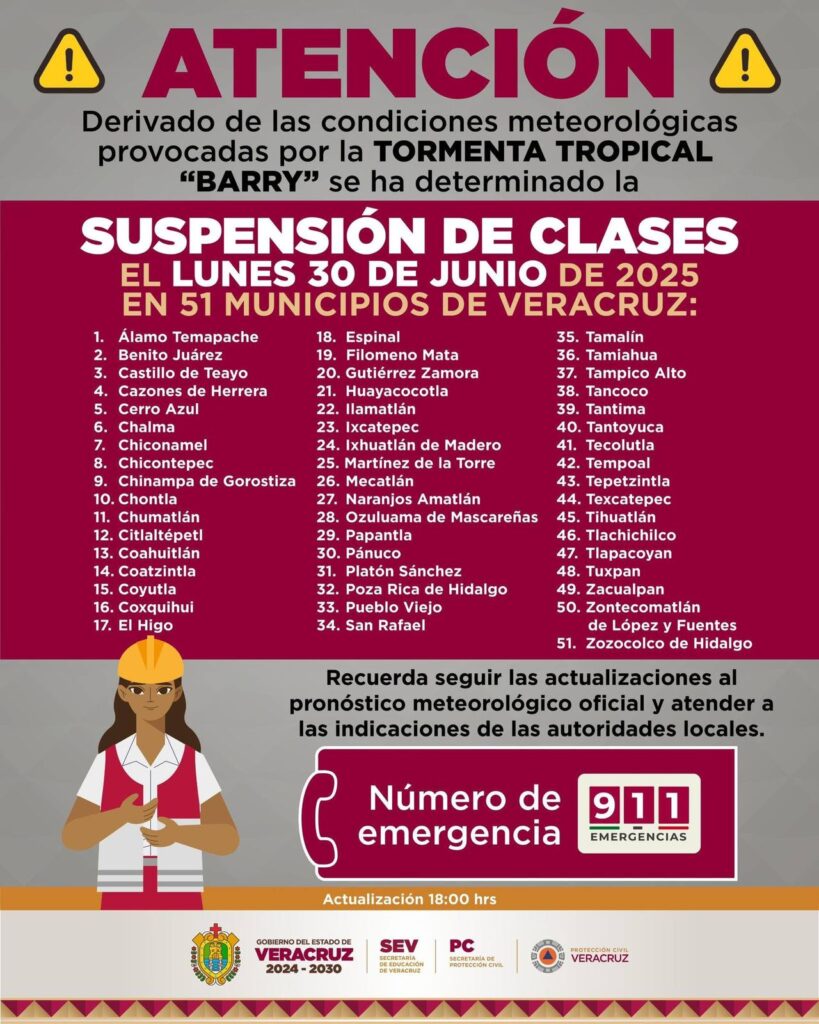 La secretaria de Protección Civil y el gobierno de Veracruz determinaron suspender las actividades escolares de este lunes, en los turnos matutino y vespertino, en 51 municipios, como medida preventiva, ante las lluvias que podría traer consigo la Tormenta Tropical Barry.