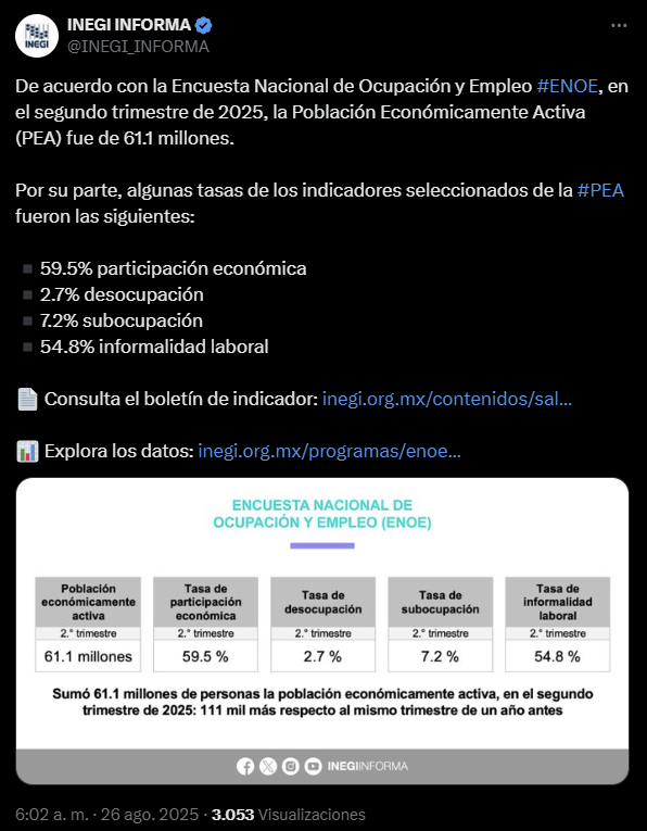 El mercado laboral en México se mantiene estable, pero con claroscuros. El Inegi reportó que en el segundo trimestre de 2025 la tasa de desempleo nacional fue de 2.7 %, equivalente a 1.6 millones de personas sin trabajo.