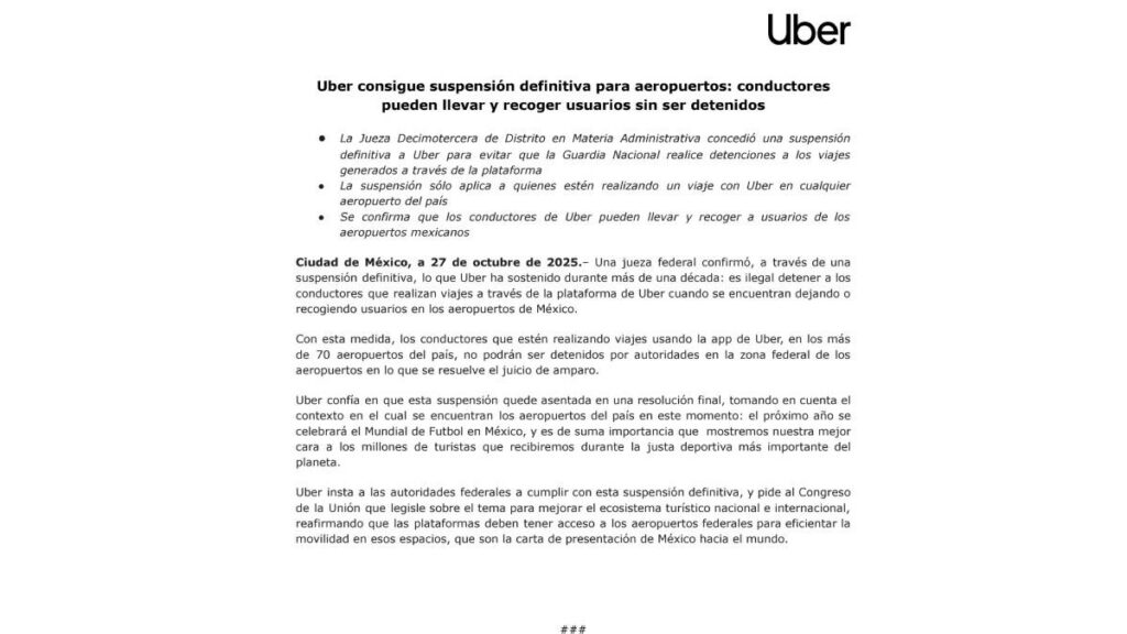 La empresa pidió a las autoridades federales respetar la resolución y recordó que su servicio forma parte del ecosistema de movilidad en los aeropuertos, donde miles de usuarios utilizan la aplicación para trasladarse de forma segura y eficiente.