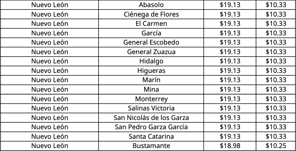 En el noreste del país, como en Monterrey, Nuevo León, el precio máximo aplicable del combustible, según la CNE, será de 19.13 pesos.