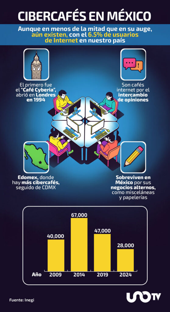 Por otro lado, con el uso del internet más extendido, al pasar de los 7 millones de usuarios en 2000 a 100.2 millones en México durante 2024, de acuerdo con el Instituto Nacional de Estadística y Geografía (Inegi), el uso de estos espacios creció de 2.4 millones de personas en 2000, a 22.4 millones en 2014, decayendo a tan solo 6.5 millones para 2024.