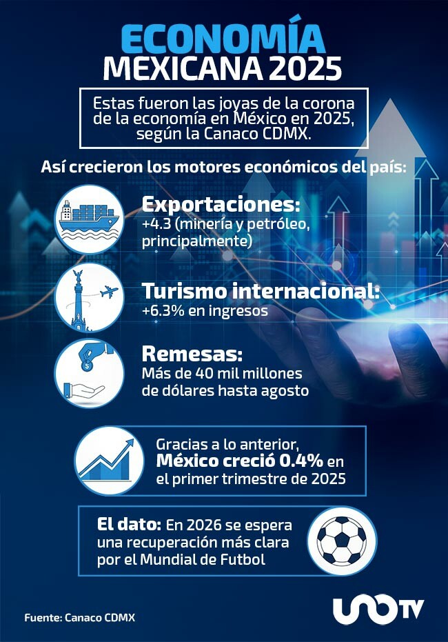 La economía mexicana logró evitar la recesión en 2025, pero avanza con un ritmo débil y dependiente del sector exportador, de acuerdo con el macroanálisis más reciente de la Cámara de Comercio, Servicios y Turismo de la Ciudad de México (Canaco CDMX).