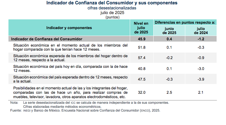 En julio de 2025, el Indicador de Confianza del Consumidor (ICC) se ubicó en 45.9 puntos, así lo informó el Instituto Nacional de Estadística y Geografía (Inegi) en conjunto con el Banco de México. Aunque esto representa un aumento mensual de 0.4 puntos, en términos anuales sigue por debajo del nivel registrado en el mismo mes de 2024, con una caída de 1.2 puntos.
