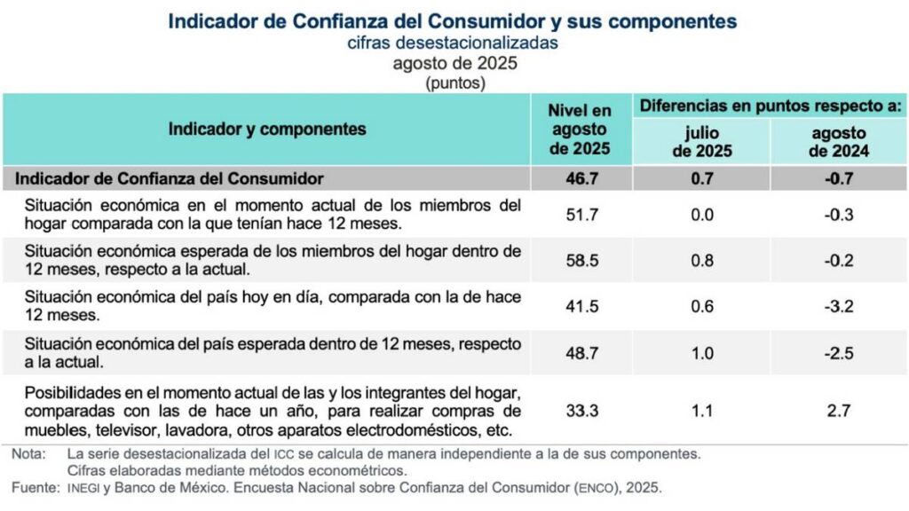 De acuerdo con la Encuesta Nacional sobre Confianza del Consumidor (ENCO) elaborada por Inegi y Banco de México, los consumidores se muestran más optimistas que en el mes anterior. Según el Indicador de Confianza del Consumidor (ICC), ascendió en agosto de 2025, 46.7, un incremento de 0.7 frente a agosto de 2024.
