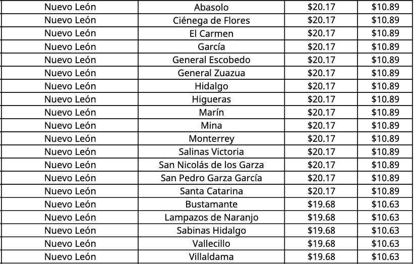 En el noreste del país, como en Monterrey, Nuevo León, el precio máximo aplicable del combustible, según la CNE, será de 20.17 pesos.