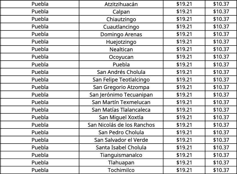 En Puebla capital el costo máximo por kilogramo será de 19.21 pesos.