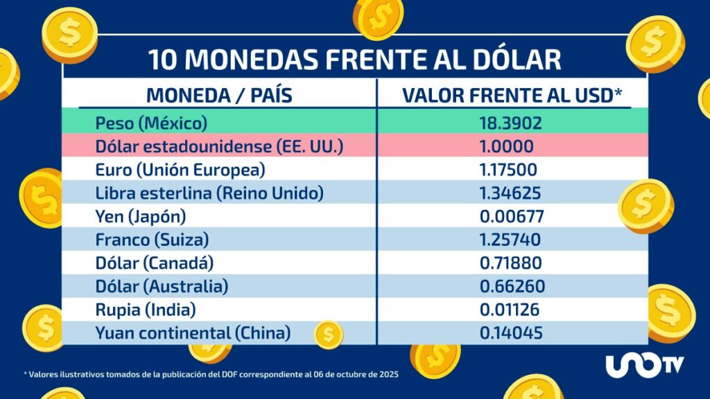 Los primeros seis días de cada mes, el Diario Oficial de la Federación (DOF) publica tablas oficiales de equivalencia entre el dólar y otras monedas, misma que sirve como referencia legal para obligaciones fiscales y contables. Aquí te explicamos cómo funciona ese mecanismo y te mostramos la equivalencia de al menos 10 divisas.
