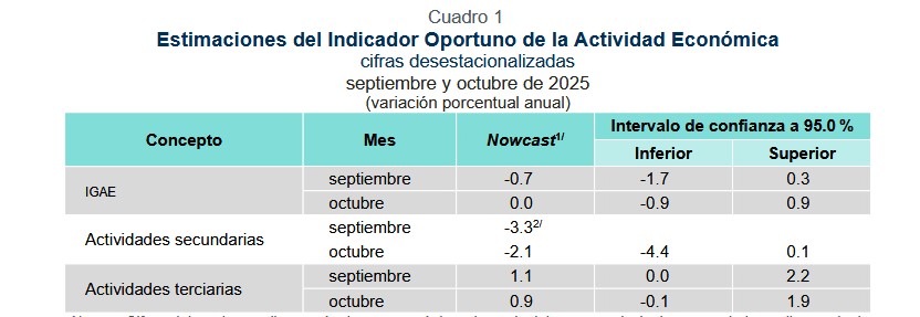 La actividad económica de México mostraría un freno en octubre de 2025. De acuerdo con el Indicador Oportuno de la Actividad Económica (IOAE), el Indicador Global de la Actividad Económica (IGAE) no registraría variación ni a tasa mensual ni anual, lo que anticipa un estancamiento en el desempeño económico.