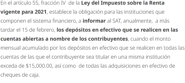 De acuerdo con el artículo 55, fracción IV, de la Ley del Impuesto sobre la Renta (ISR), los bancos deben avisar al SAT cuando una persona recibe depósitos en efectivo mayores a 15 mil pesos en un sólo mes.