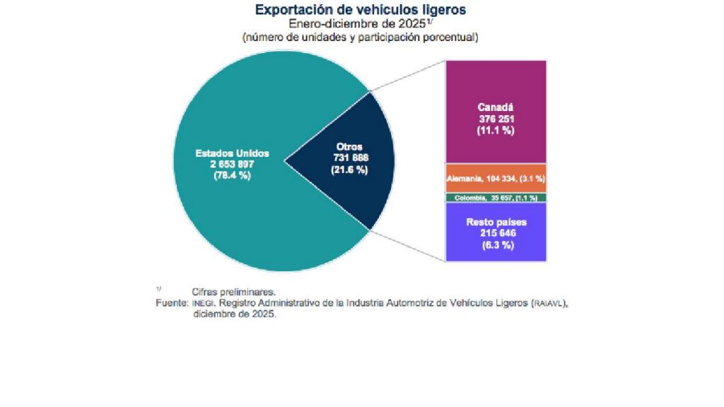 Pese a la caída, Estados Unidos se mantuvo como el principal mercado de exportación, concentrando 78.4% del total, con 2.65 millones de unidades enviadas durante 2025.