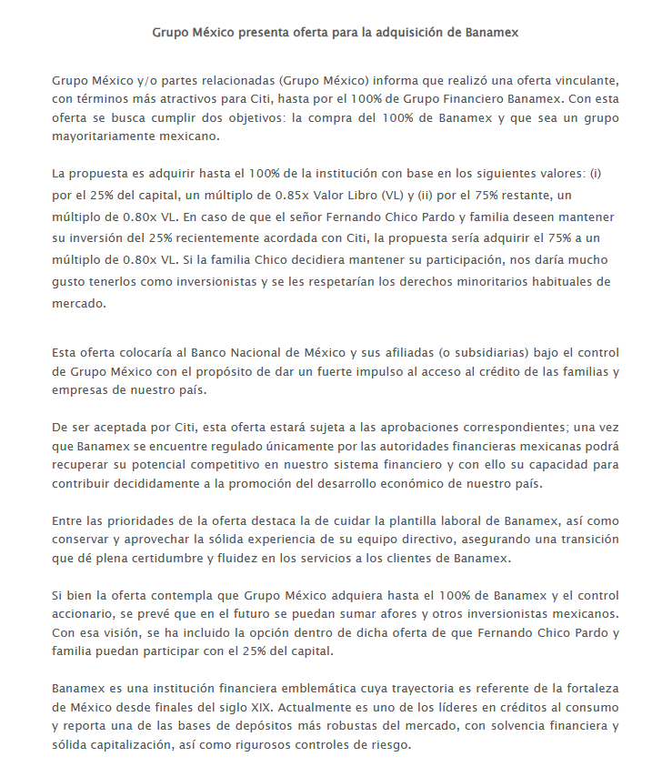 Grupo México informó que presentó una oferta vinculante para adquirir hasta el 100% de Banamex, con condiciones que, aseguró, resultan más atractivas para Citi. La propuesta busca que el banco permanezca bajo un grupo mayoritariamente mexicano y garantizar la continuidad de sus operaciones en el país.