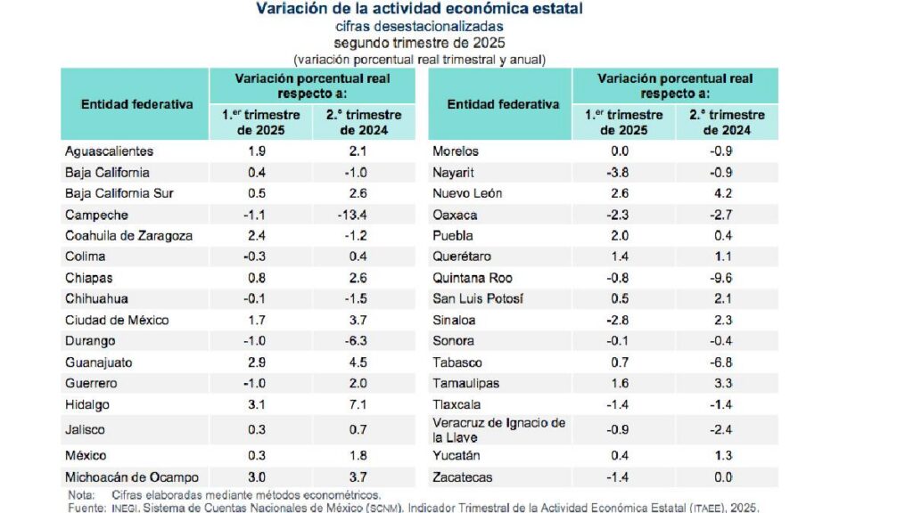 Desigual, sería la palabra que nombraría a la evolución económica mexicana de los estados durante el segundo trimestre de 2025, esto de acuerdo con el Indicador Trimestral de la Actividad Económica Estatal (ITAEE) del Inegi. Así Guanajuato, Hidalgo y Nuevo León fueron las entidades con el mayor crecimiento, mientras que Campeche y Sinaloa registraron los descensos más marcados.