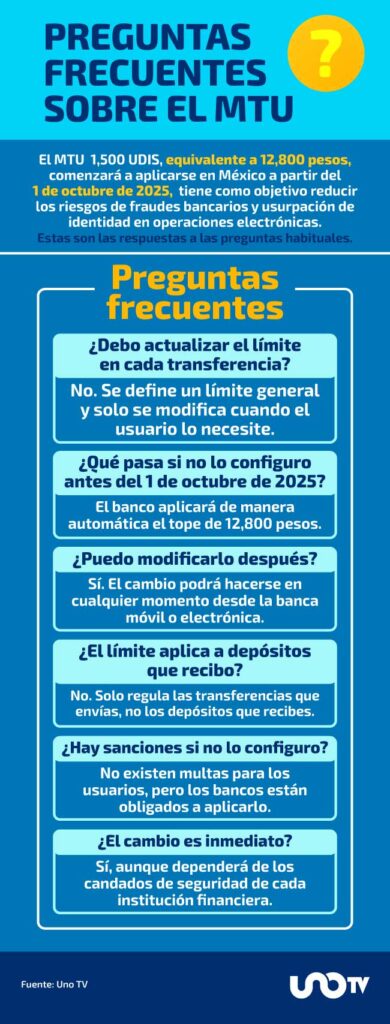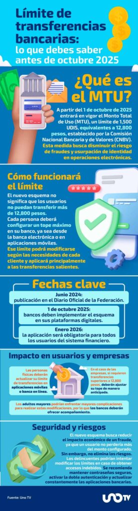 El MTU límite de transferencias bancarias de mil 500 UDIS, equivalente a 12 mil 800 pesos, comenzará a aplicarse en México a partir del 1 de octubre de 2025, de acuerdo con las disposiciones publicadas en el Diario Oficial de la Federación (DOF) el 1 de junio de 2024. La medida fue establecida por la Comisión Nacional Bancaria y de Valores (CNBV) y tiene como objetivo reducir los riesgos de fraudes bancarios y usurpación de identidad en operaciones electrónicas.