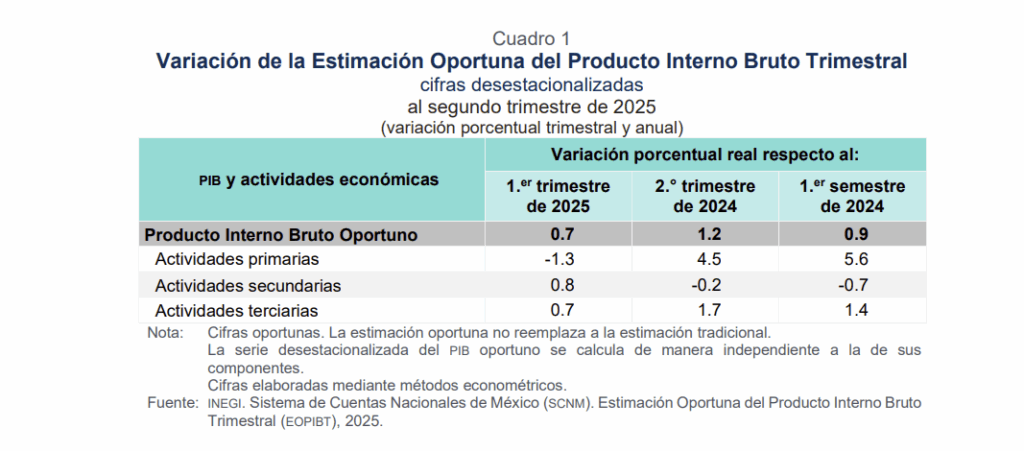 La Estimación Oportuna del Producto Interno Bruto Trimestral (EOPIBT) revela que la economía mexicana también creció 0.7% a tasa trimestral. Aunque el entorno internacional es incierto, el país logró mantener una trayectoria positiva, impulsada principalmente por el sector terciario, que avanzó 0.7% en el trimestre y 1.7% a tasa anual.