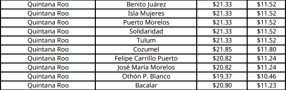 En Chetumal (Othón P. Blanco), capital de Quintana Roo, el precio máximo aplicable por kilogramo aumenta a 19.37 pesos.