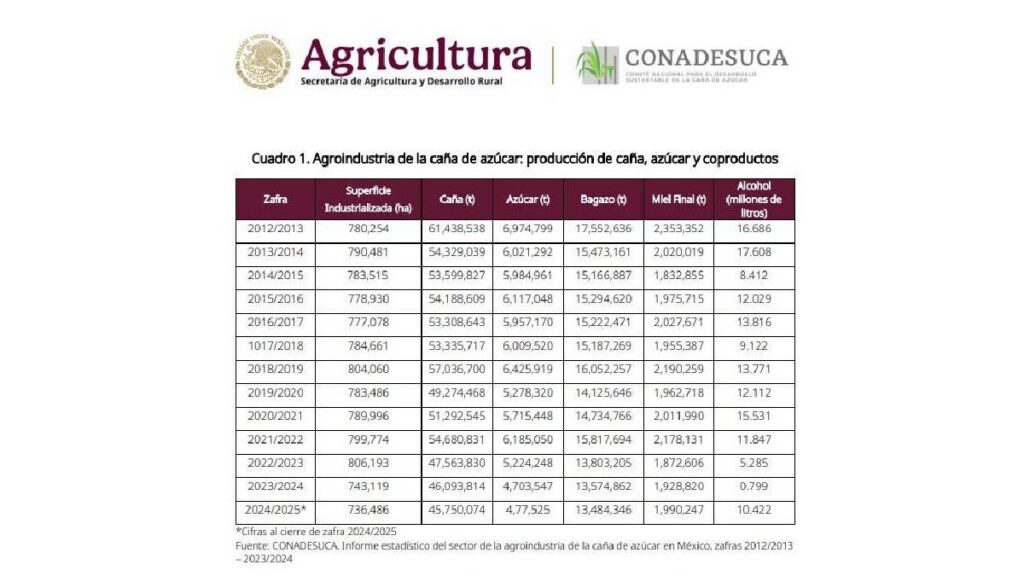 La caña de azúcar es una tradición que lleva más de 500 años en el territorio mexicano y una fuente de vida para cerca de 290 municipios donde operan 47 ingenios azucareros. En 2024, el valor de su producción superó los 50 mil millones de pesos, equivalente al 37% del valor generado por el maíz grano, según datos del Secretaría de Agricultura y Desarrollo rural (SIAP).