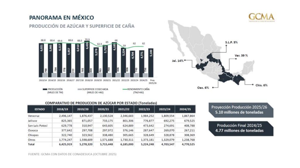 Casi cuatro de cada 10 toneladas de azúcar nacional se producen en Veracruz, seguido por Jalisco (14%), Chiapas (6%), Oaxaca (6%) y San Luis Potosí (3%). Pero incluso en estas zonas históricamente fuertes, la zafra 2024/2025 cerró con caídas: