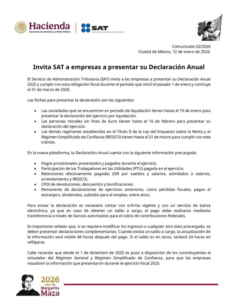 Con la entrada de 2026, el Servicio de Administración Tributaria (SAT) se prepara para recibir la Declaración Anual 2025 de las empresas, un trámite obligatorio que debe presentarse en fechas específicas para evitar multas y sanciones por parte de la autoridad fiscal.
