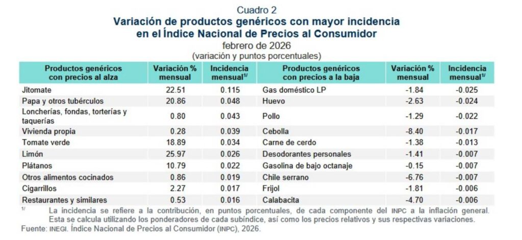 La inflación general anual incrementó un 4.02% durante febrero de este 2026. El limón, el jitomate y la papa son algunos de los productos que más aumentaron, así como los servicios de loncherías y vivivenda, según el Instituto Nacional de Estadística y Geografía (Inegi).