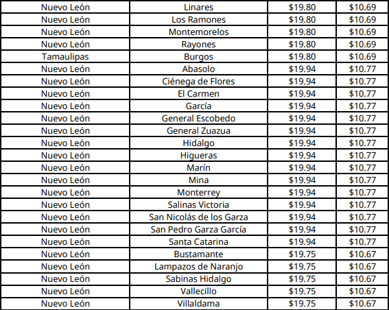 En el noreste del país, como en Monterrey, Nuevo León, el precio máximo aplicable del combustible, según la CNE, será de 19.94 pesos.