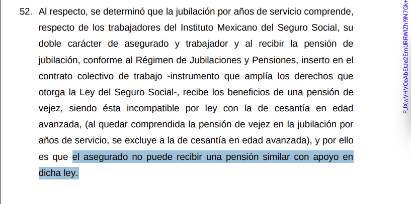 En la sentencia, la SCJN determinó que el Régimen de Jubilaciones y Pensiones del IMSS ya cubre el riesgo de vejez, por lo que otorgar además la pensión legal implicaría una duplicidad injustificada.