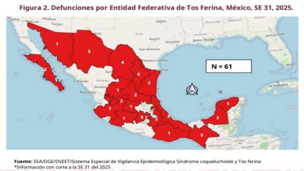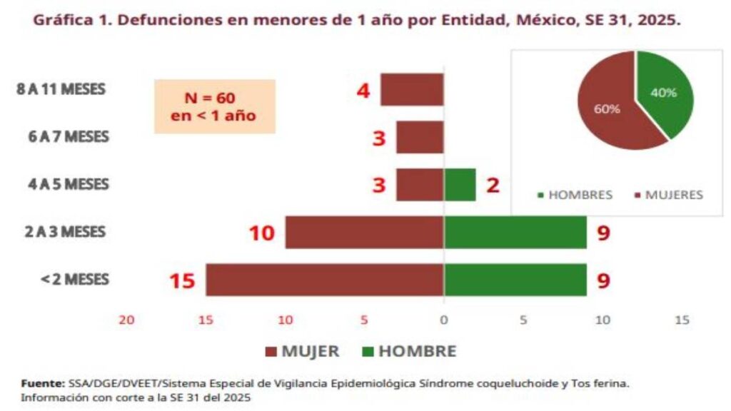 Hasta la semana 31 de 2025 se han registrado 61 muertes, de las cuales 60 fueron menores de un año sin antecedentes de vacunación. El 88.3% eran bebés menores de seis meses.