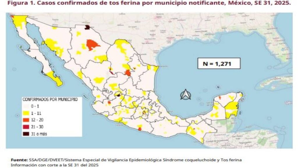La tosferina avanza en México, de acuerdo con el último boletín de la Dirección General de Epidemiología de la Secretaría de Salud, con corte al 8 de agosto de 2025, se han confirmado mil 271 casos de esta enfermedad respiratoria, un aumento drástico en comparación con los 223 casos registrados en 2024.