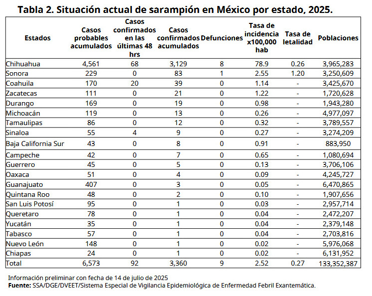 Desde el inicio del brote de sarampión en México, Chihuahua ha sido el estado con mayor concentración de casos. Con corte al 14 de julio, presenta 3 mil 129 casos acumulados, es decir, el 92.8% de los casos totales.