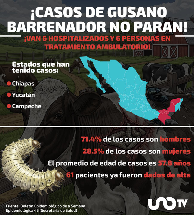La Secretaría de Salud (SSA) confirmó que seis personas fueron hospitalizadas por miasis de gusano barrenador, mientras que otros seis pacientes se encuentran en tratamiento ambulatorio por la misma causa, según muestra el Boletín Epidemiológico de la Semana Epidemiológica (SE) 45, que abarca del 2 al 8 de noviembre de 2025.