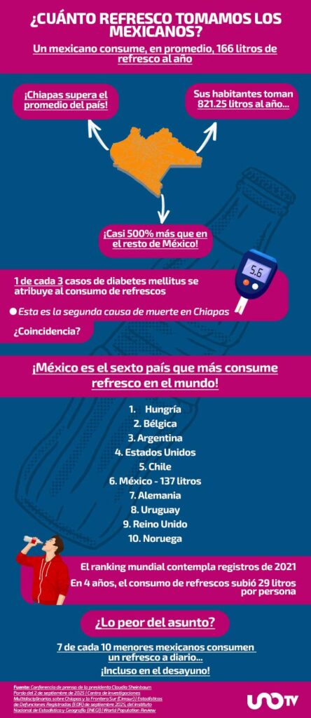 “Se calcula que cada habitante de Chiapas bebe 821.25 litros de refresco por año, mientras que 160 litros es el consumo per cápita en todo el país“, destaca el documento publicado en 2020.