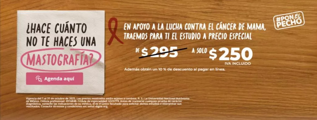 Cabe destacar que Salud Digna tiene laboratorios en 29 estados de México y ofrece mastografías en 250 pesos del 1 al 31 de octubre con motivo del Mes de Sensibilización sobre el Cáncer de Mama.