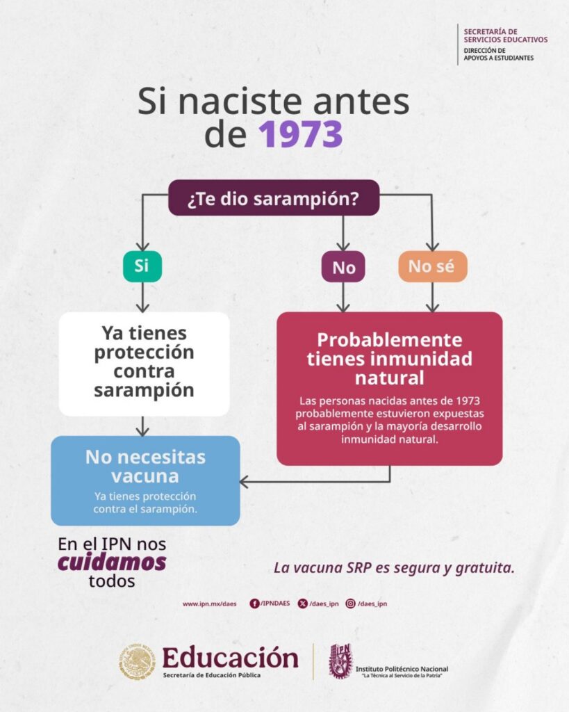 El Instituto Politécnico Nacional (IPN) difundió una serie de gráficos para indicar, según el año de nacimiento, quiénes deben vacunarse contra el sarampión y quiénes no, con motivo al brote de sarampión que comenzó en México desde 2025.