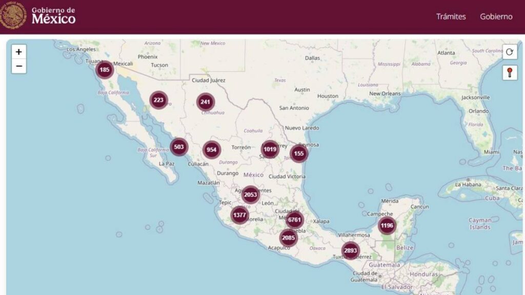 Al ingresar, se despliega un mapa de la República Mexicana con puntos guindas que contienen números en su interior. Al acercar el cursor o usar un dispositivo móvil, los usuarios pueden visualizar:
