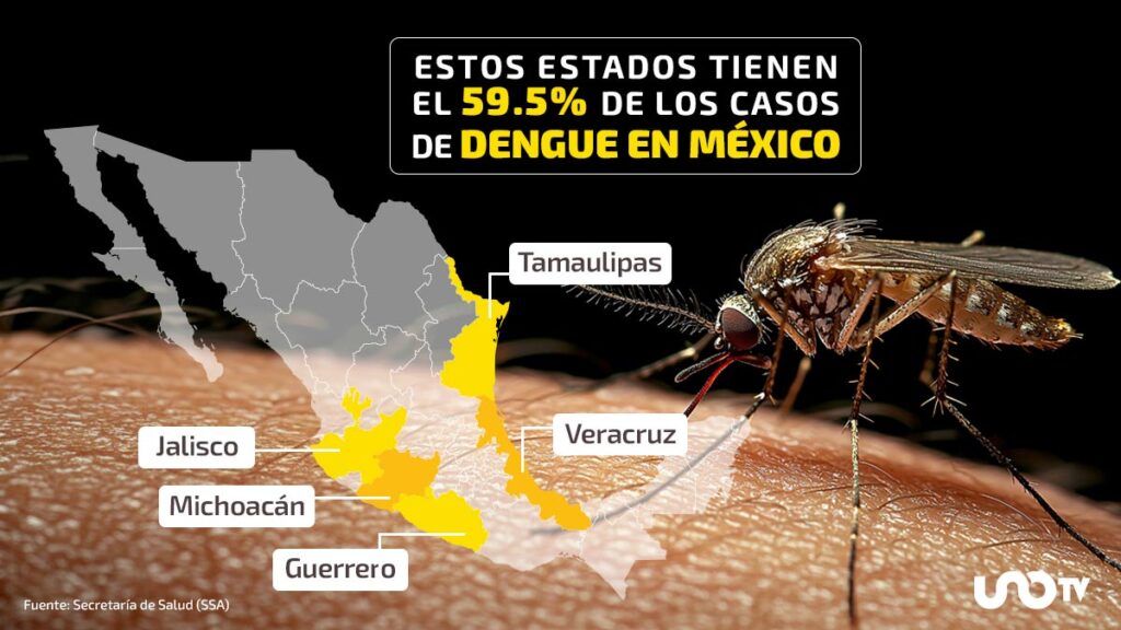 El 59.5% de los casos confirmados de dengue en México corresponden a los estados de Jalisco, Veracruz, Michoacán, Guerrero y Tamaulipas, según se dijo este martes en la conferencia matutina desde Palacio Nacional.