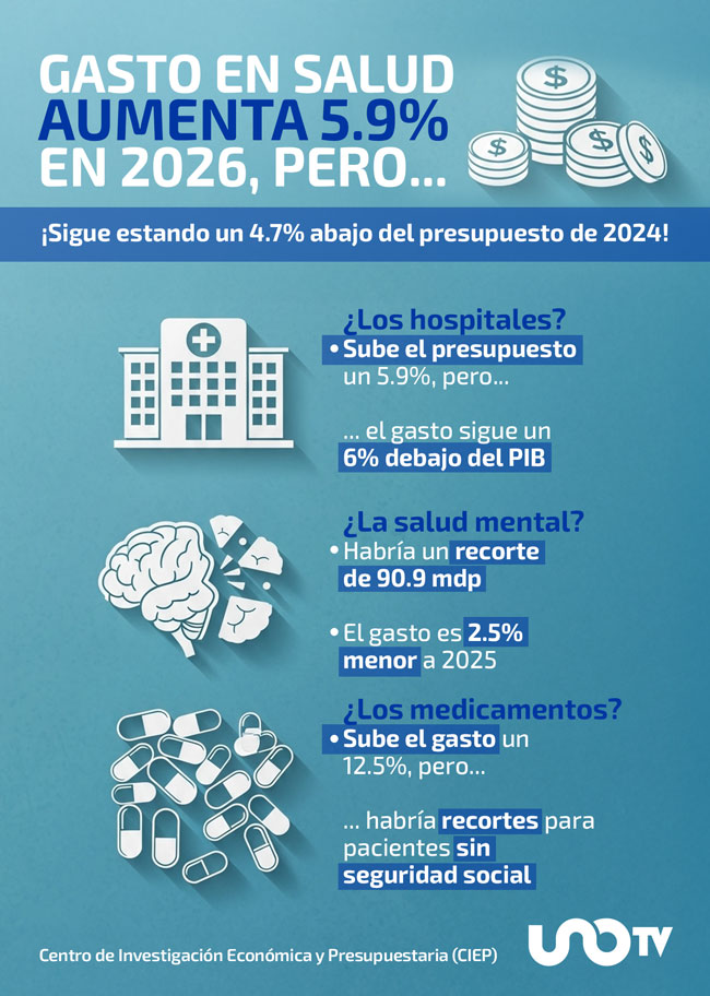 Para 2026, el presupuesto para salud mental tendría un recorte de 90.9 mdp, lo que equivale a 2.5% menos que en 2025, de acuerdo con el análisis del CIEP; esto se manifestaría principalmente en la Comisión Nacional de Salud Mental y Adicciones (CONASAMA).