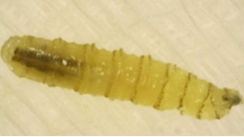 estadio larval, conocido como gusano barrenador del ganado, es un parásito que se sitúa en los tejidos de animales de sangre caliente, incluyendo al ser humano.