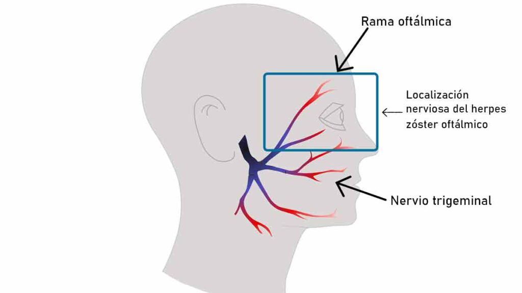 Es una de las manifestaciones del herpes zóster trigeminal, ya que el virus afecta el nervio trigeminal, el cual se divide en la rama oftálmica, la rama maxilar y la rama mandibular.