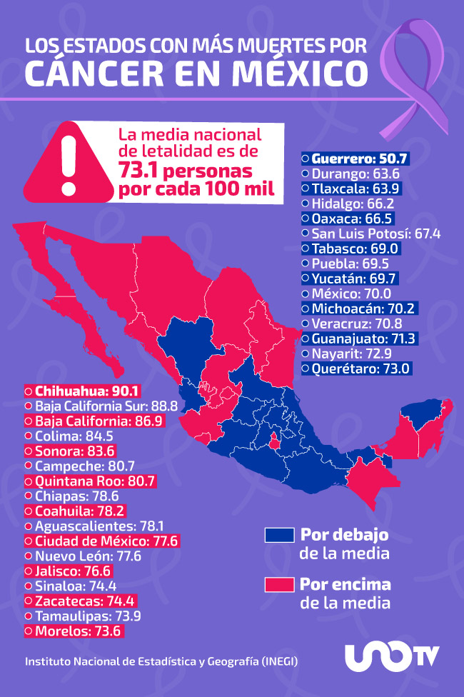 De esta manera, Chihuahua es el estado del país con la tasa más alta de defunciones por cáncer, seguido por Baja California Sur, Baja California, Colima, Sonora, Campeche y Quintana Roo, con tasas superiores a 80 personas por cada 100 mil.