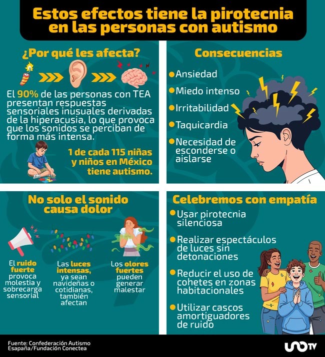 Las personas con trastorno del espectro autista (TEA) y con trastornos del procesamiento sensorial no perciben los estímulos auditivos de manera habitual, de acuerdo con la Fundación Conectea. Muchas presentan reacciones intensas frente a ruidos de alto impacto, como cohetes, petardos y fuegos pirotécnicos, los cuales son comunes en fechas decembrinas.