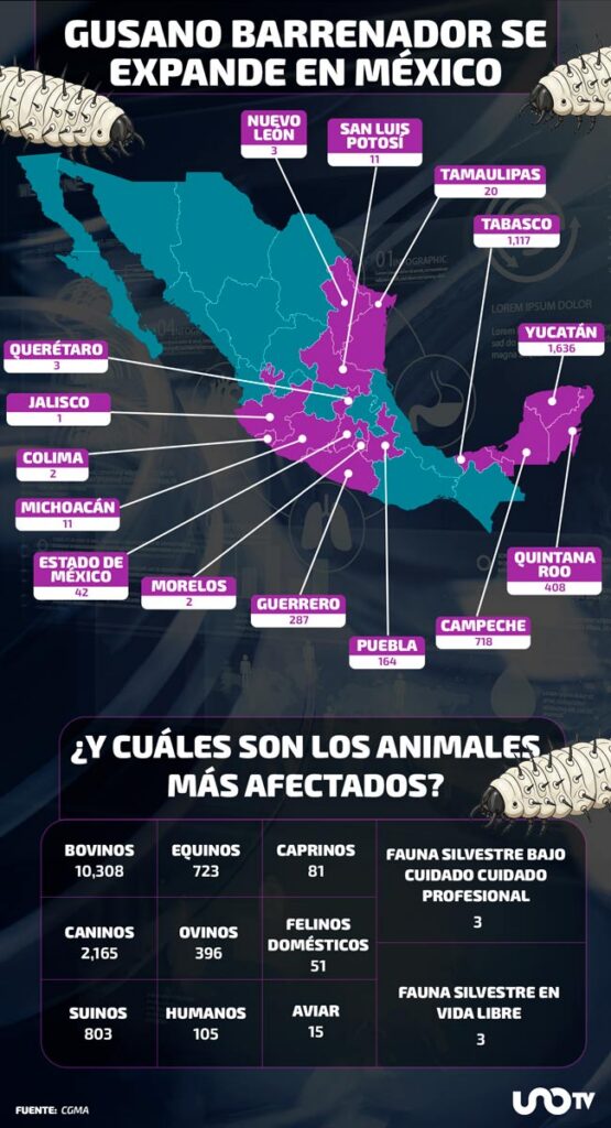 La República Mexicana tiene 14 mil 653 casos acumulados de gusano barrenador del ganado (GBG) hasta el 26 de enero en nueve especies y fauna silvestre; los animales más afectados son las vacas, perros y puercos, mientras que se han registrado 105 casos en humanos, según el Grupo Consultor de Mercados Agrícolas (GCMA).