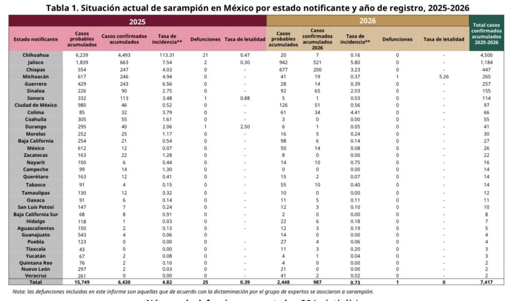 En la entidad del deceso se registran 265 casos confirmados. La mayoría de los contagios se concentra en personas que no contaban con el esquema de vacunación completo. Hasta ahora, se reportan 7 mil 417 casos y 26 fallecimientos entre 2025 y lo que va de 2026, con presencia del virus en todas las entidades federativas y 265 municipios.