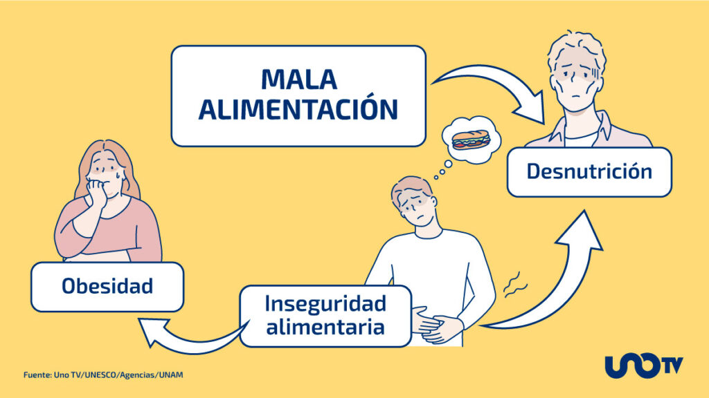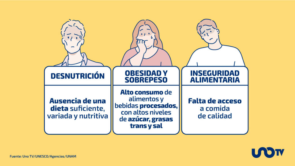 Los fenómenos de desnutrición y obesidad aunque paradójicos entre sí, encuentran su origen en una mala alimentación, producto de la ausencia de una dieta suficiente, variada y nutritiva y el predominio de alimentos y bebidas procesados, con altos niveles de azúcar, grasas trans y sal, según la UNESCO.