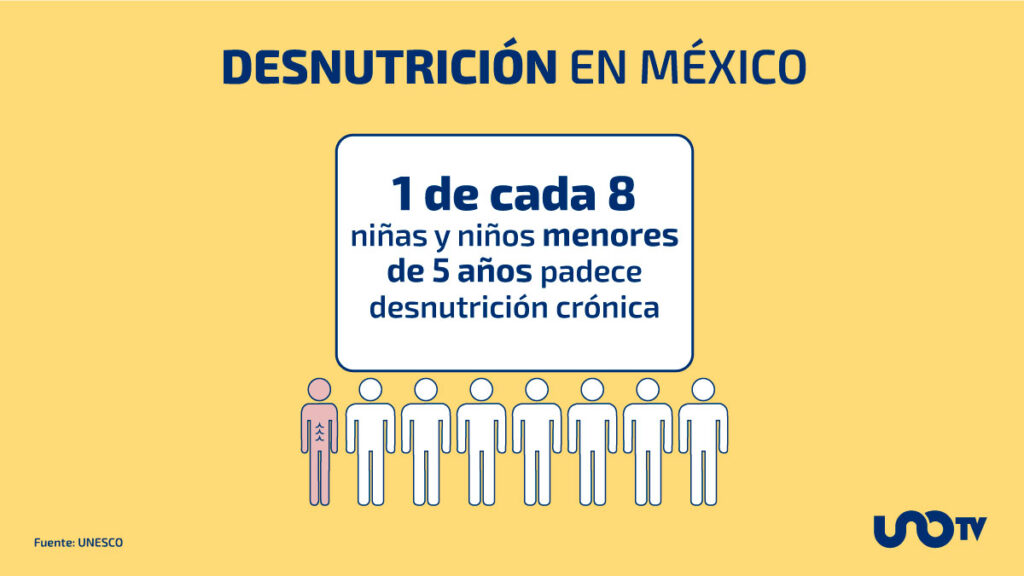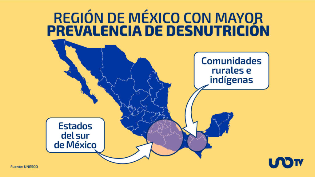 1 de cada 8 niñas y niños menores de 5 años padece desnutrición crónica. La desnutrición se presenta principalmente en los estados del sur de México y en las comunidades rurales más que en las urbanas; los más afectados son los hogares indígenas.