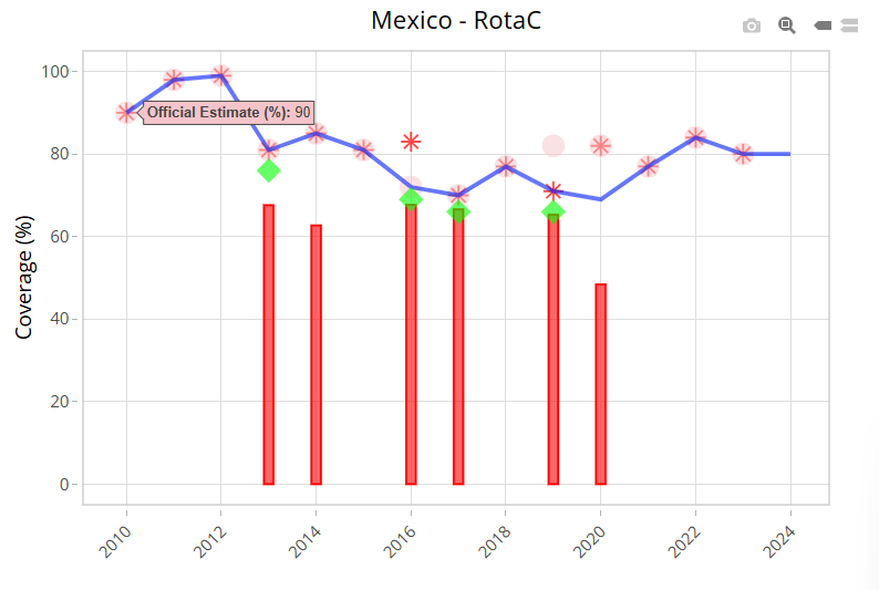 La cobertura de vacunación contra rotavirus hasta 2024 fue de 80%, un porcentaje menor al registrado en 2022 donde los número alcanzaban 4% más. No obstante, este número se mantiene como entre las mejores cifras respecto a años como 2021, 2020, 2019 y 2018.