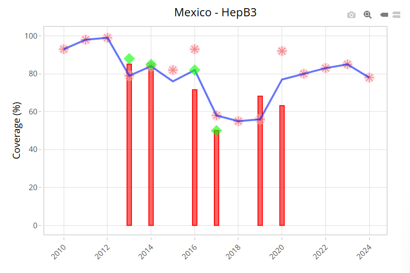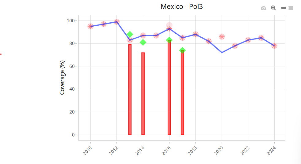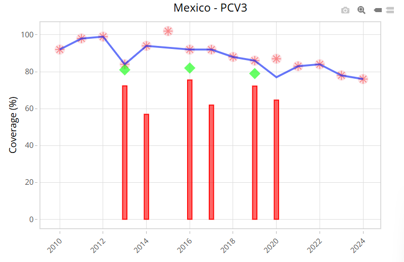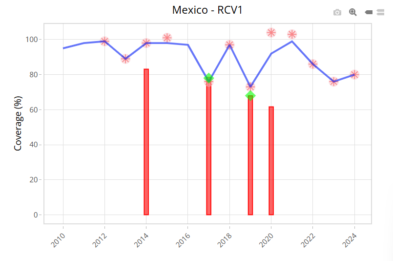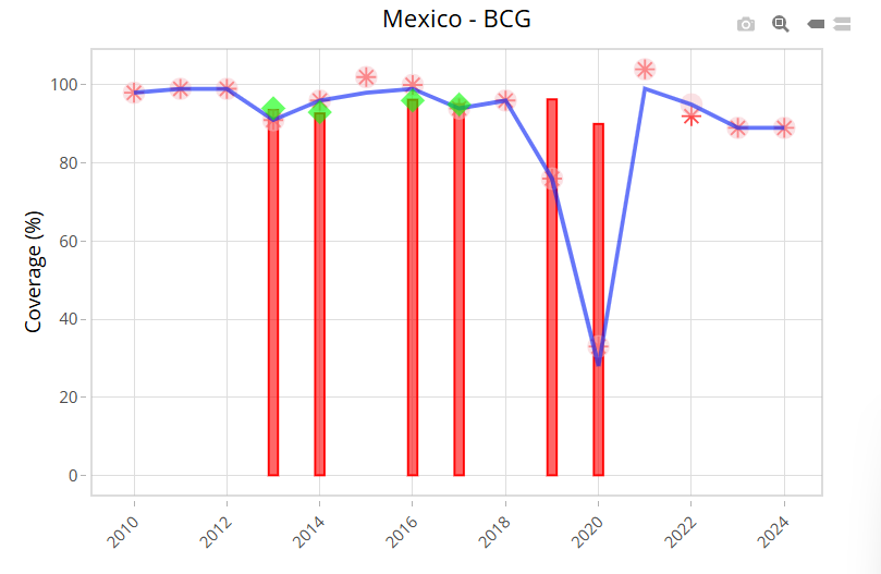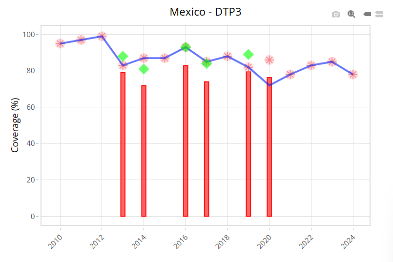 Según estimaciones de la OMS y la UNESCO sobre la cobertura de inmunización, hasta 2024 en México se tenían los siguientes porcentajes de cobertura de vacunación: