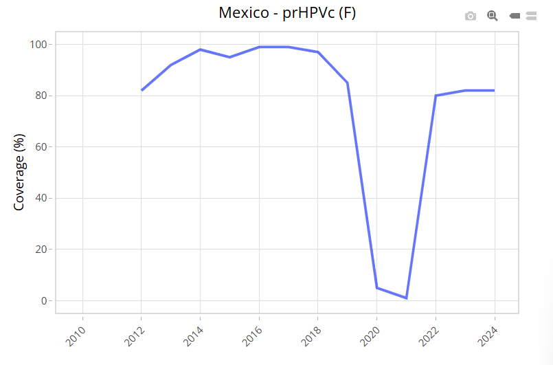 Hasta 2024, el porcentaje de cobertura inmunológica contra el Virus del Papiloma Humano era de 82%. Un índice mayor al registrado en 2021 donde se registró un 1% de cobertura.