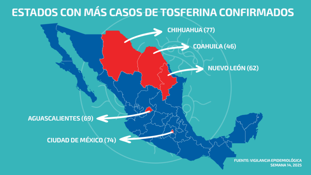 La tosferina es una enfermedad de las vías respiratorias que afecta, principalmente, a bebés y niños. Según el último reporte de las autoridades de salud, en México se han detectado 696 casos confirmados en lo que va de 2025. Sin embargo, la cifra podría aumentar debido a que existen dos mil 549 casos sospechosos. A estas cifras se suman 37 defunciones por esta misma enfermedad.